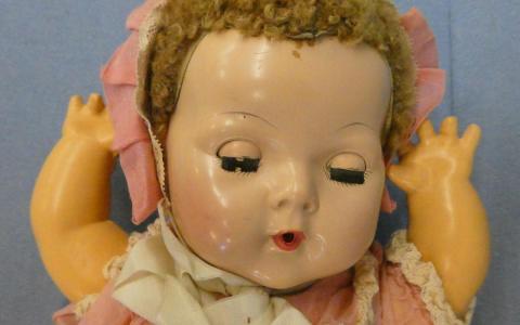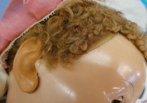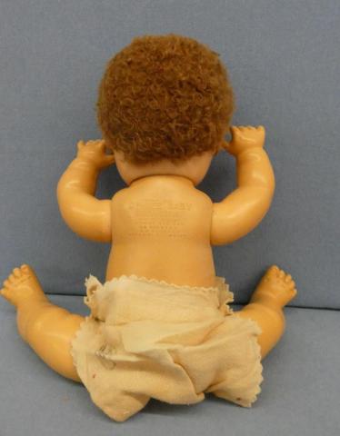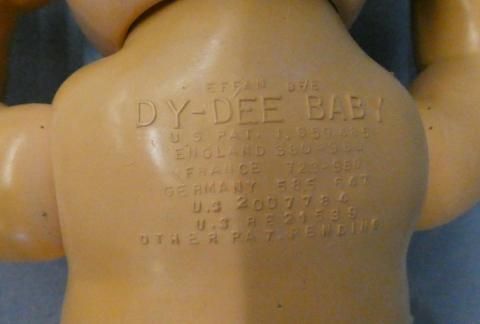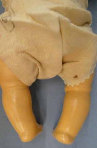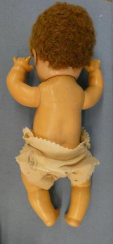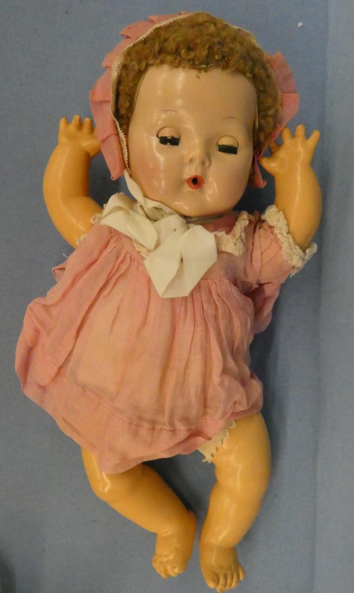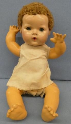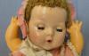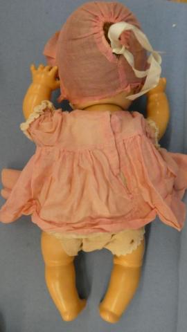 **EFF01 15" Dy-dee Baby by Effanbee with Rattle Original dress, diapers and bonnet? Missing a few eyelashes ~ connector for legs broke, legs are carefully glued on Price: $125.00Status: Available Additional Images