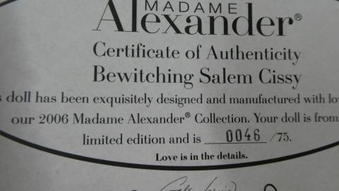 Madame Alexander 2006 Bewitching Salem Cissy Bewitching Salem Cissy 45610 Ltd ed 0046 of 75 pcs (lid faded) Year: 2006Price: $350.00Condition: Never Removed From BoxStatus: Available Additional Images
