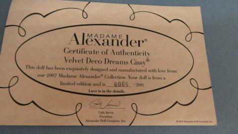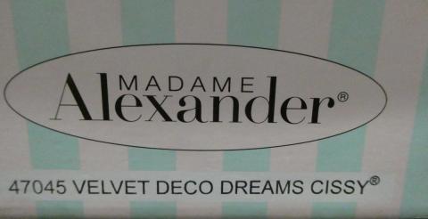 Madame Alexander Velvet Deco Dreams Cissy Velvet Deco Dreams Cissy Ltd edition # 0006 of 200 47045 (some damage to box top) Year: 2007Price: $500.00Condition: Mint in BoxStatus: Available Additional Images