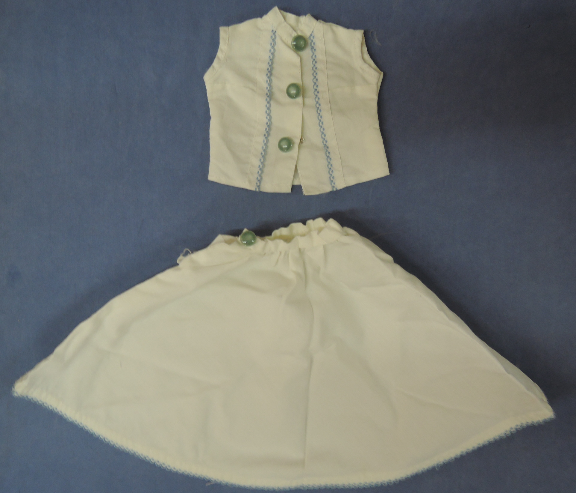 E18 Skirt and Blouse White Cotton Skirt and Blouse Made by professional seamstress in the 1950's for a 16 1/2" Elise Doll Price: $25.00Condition: Lightly Played WithStatus: Available